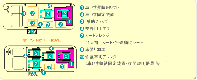 ハイエーストロングに車いすを同時に3基積める仕様を作りました。車いすが乗らないときは、折り畳み専用シートを降ろせば大人二人が余裕で座れます。さまざまなシチュエーションに対応できるレイアウトになります。